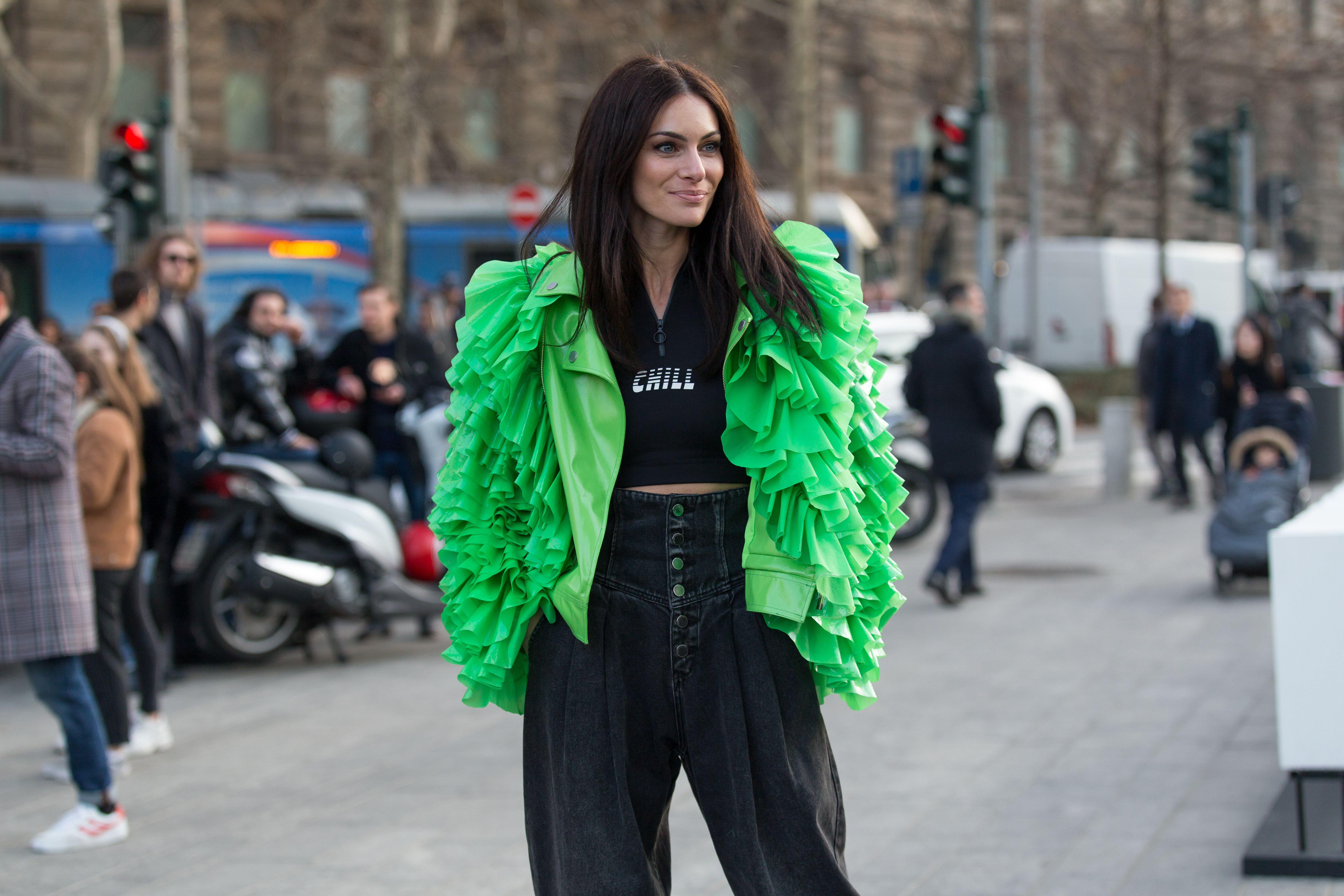 A guest is seen in a frilly green jacket outside Milan Fashion Week.