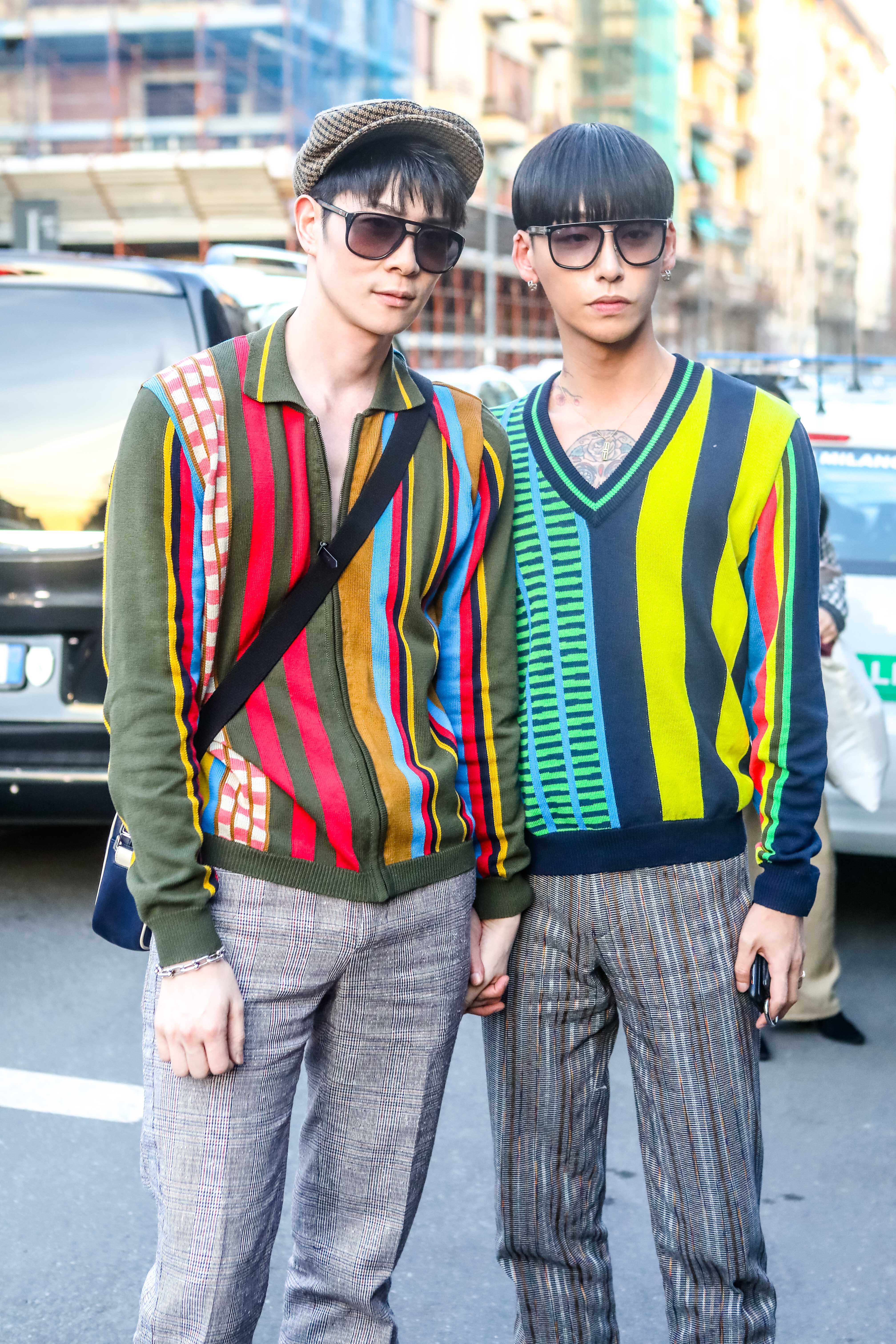 Sisters Ami Suzuki and Aya Suzuki wear wildly colorful ensembles outside Milan Fashion Week.