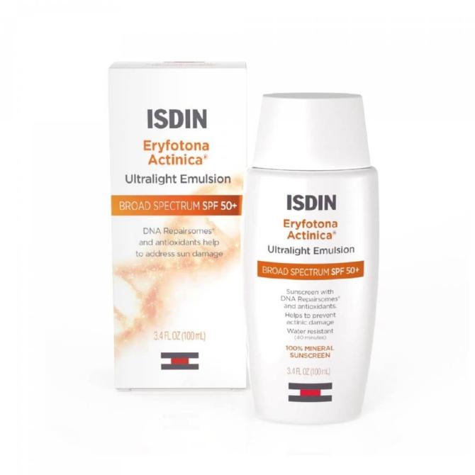 “I like ISDIN Eryfotona Actinica Ultralight Emulsion sunscreen because it’s completely mineral-based and has DNA repairsomes and antioxidants to actually help repair skin quality.” – Jeannel Astarita, Celebrity Esthetician