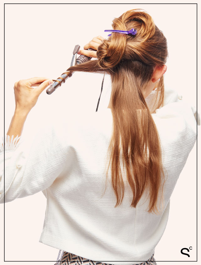 3. Take one-inch sections from the hair that’s down and and wrap them around a one-inch curling iron, alternating directions as you go.