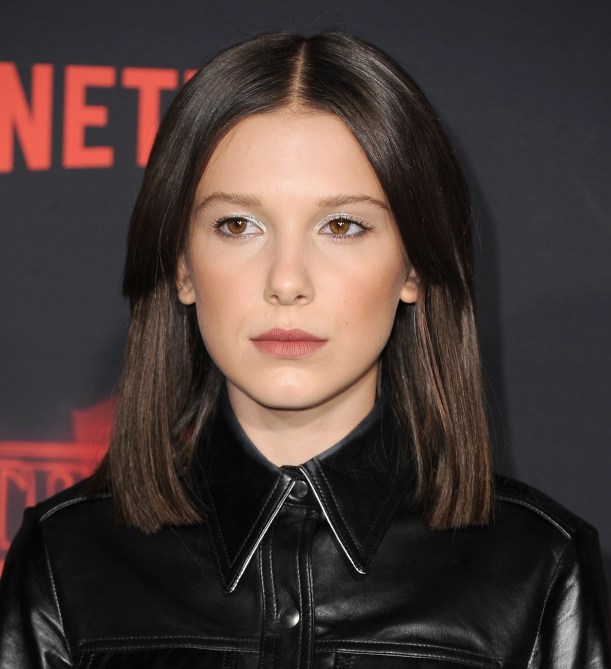 On Thursday, the 13-year-old actress stepped out in Los Angeles for the season two premiere of “Stranger Things,” which debuted today on Netflix. But the show’s return wasn’t the only thing creating buzz last night. On the red carpet, Brown ditched Eleven’s badass buzzcut for a sleek shoulder-length lob. The actress’s chestnut-brown hair, which is usually seen in a grown-out pixie cut at public events, was parted down the middle, with not a flyaway or split end in sight.