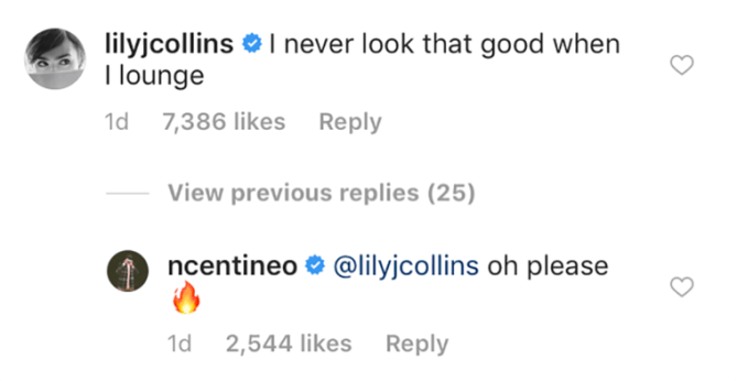 “I never look that good when I lounge,” Collins wrote. So—that’s a clear compliment hidden underneath self-deprecating humor. She’s basically tossing it out there to see if he’ll come back with a compliment to her. Because obviously she’s stunning and probably looks equally as good—if not better—when she’s “lounging.” (Though, TBH she’s also calling him out for looking oh-so-casual when in fact he’s on an intense set with highly trained people who’s sole purpose is to make him look that way.)