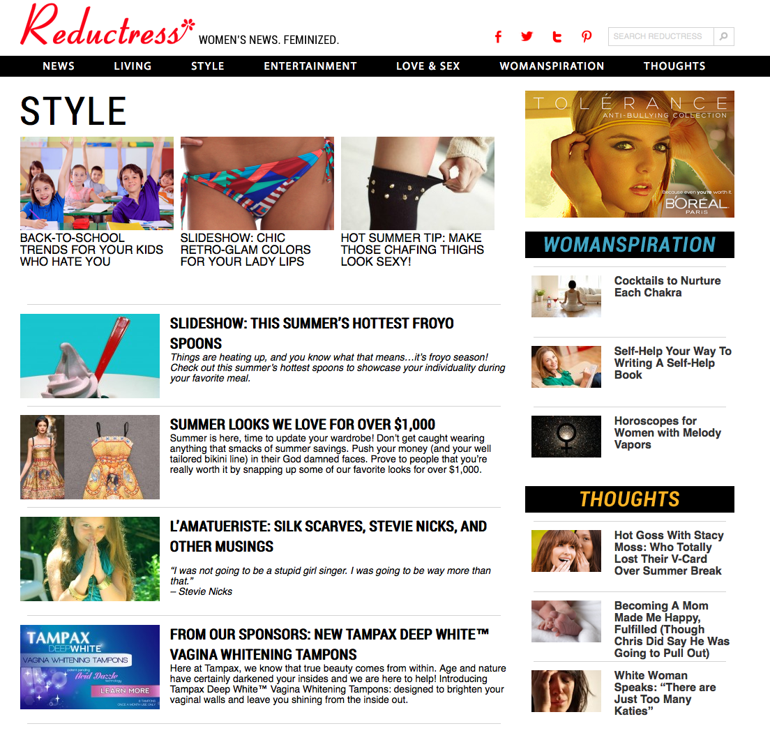 reductressAround here, we’re endlessly fascinated by the wide world of online fashion, style, and shopping, and it seems that every week brings with it a brand-new site to be obsessed with. Since keeping track of ‘em all can be a feat of epic proportion, we’ve decided to feature “A Site To See” every Monday, which highlights a cool new website you’ll definitely want to bookmark. This week: a hilarious lifestyle site called Reductress.
