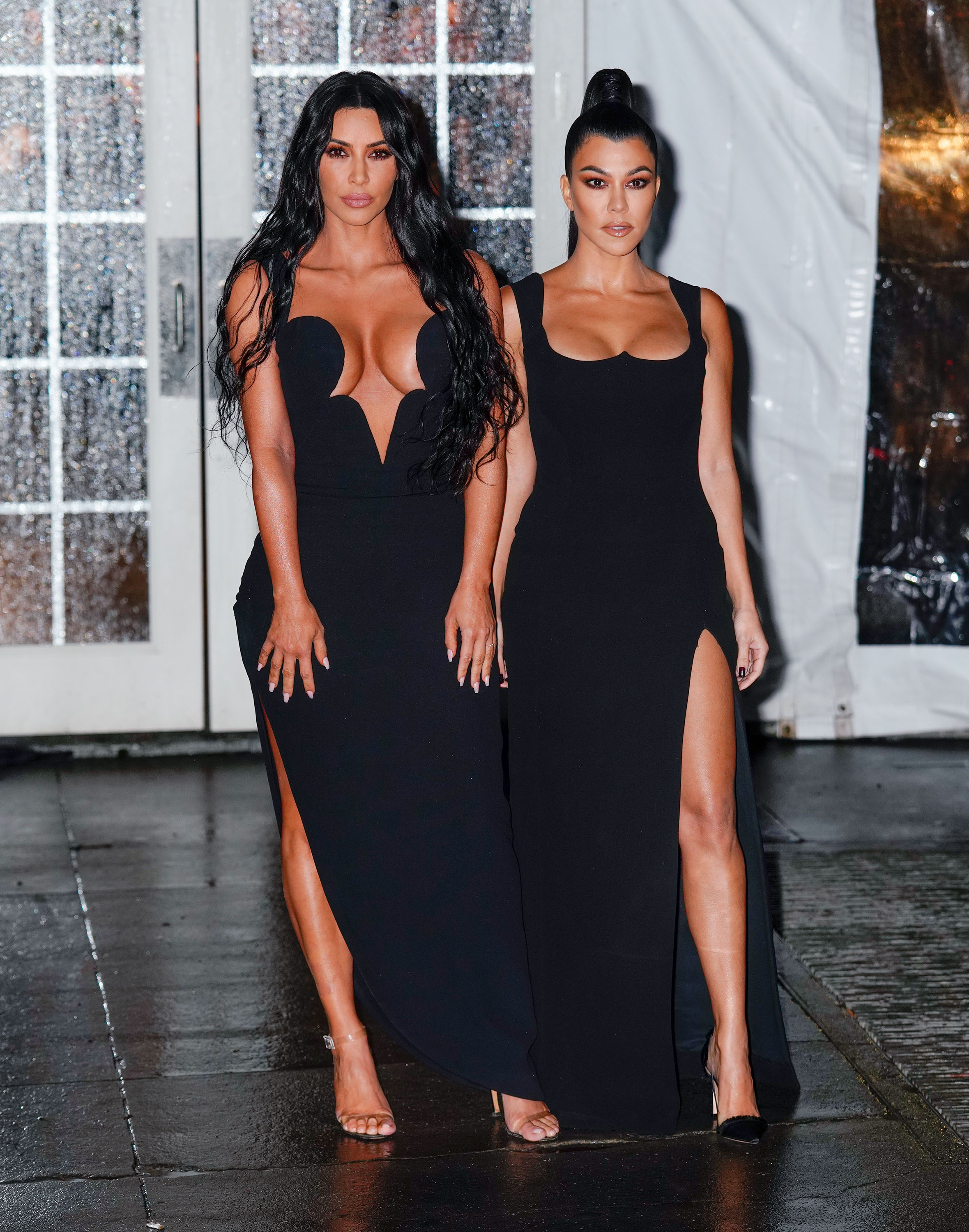 The biggest difference between the sisters’ ensembles was their choice in shoes—Kim in clear heels and Kourtney in black, pointed-toed ones. Plus, Kim went for a mermaid hair look, while Kourtney chose a half-up hairdo. Other than that, though, they look like characters out of a dystopian novel I read in middle school—part of an army of perfectly coifed clones.