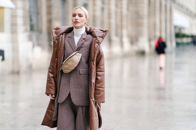 A guest wears a brown long puffer coat, a Balenciaga fanny pack bag, a checked blazer jacket and a white turtleneck outside Alexis Mabille.