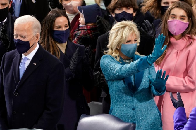 First Lady Dr. Jill Biden stunned in a custom blue look by NYC-based label Markarian, which featured a sparkling coat and dress with sheer neckline, embellished collar and tonal blue detailing. Oh, and a set of blue satin gloves with matching mask, of course.