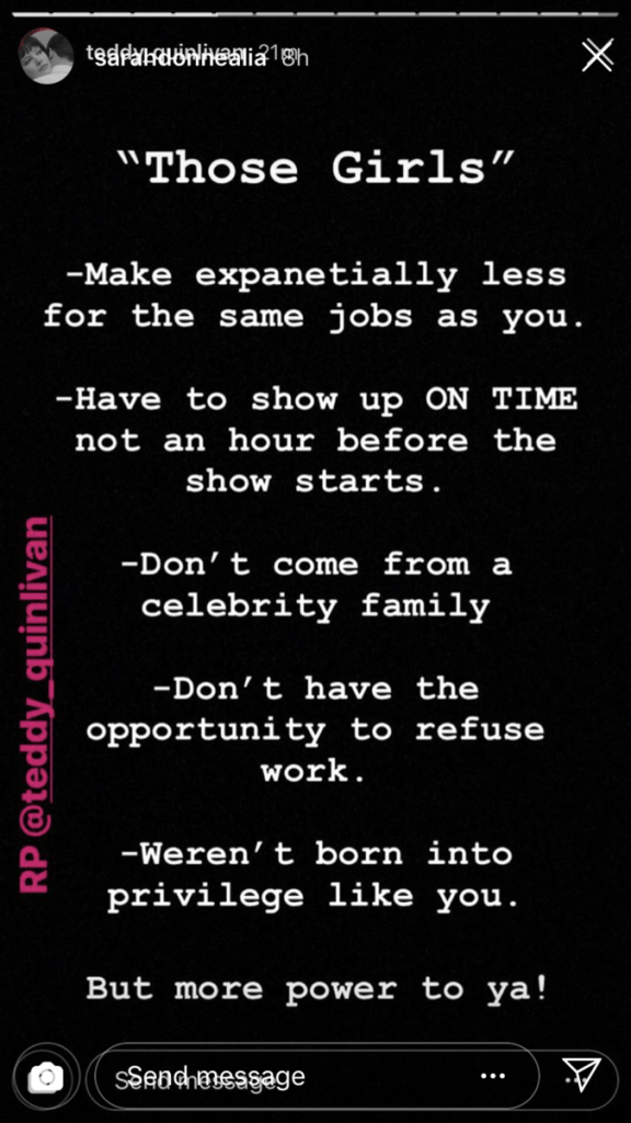 Another model added, “‘Those girls’ make expanentially [sic] less for the same job as you…Don’t come from a celebrity family…Weren’t born into privilege like you.”