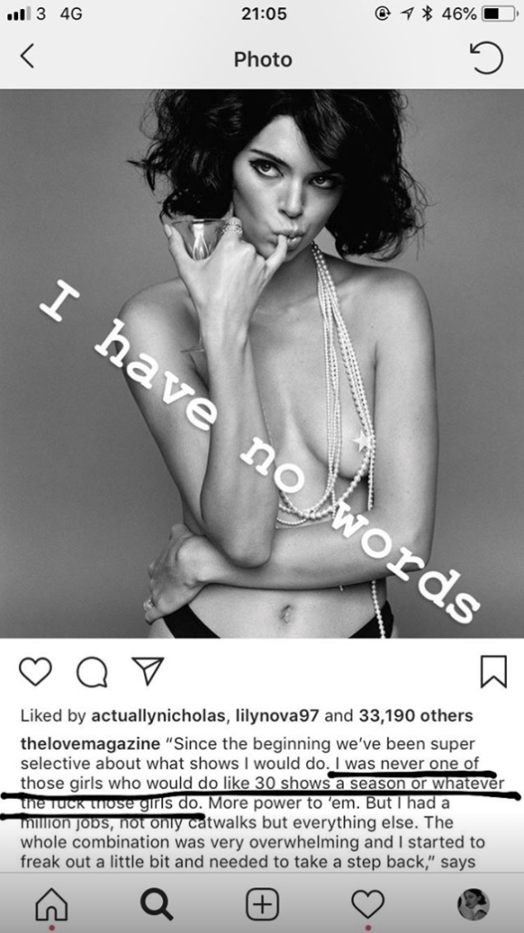 Jenner’s comment eventually made it to Love magazine’s Instagram, where it was seen by dozens of models, including Daria Strokous, Marine Deleeuw and Jac Jagaciak, W magazine first reported. In screenshots on their own Instagram stories, the models criticized Jenner for looking down on models who need to walk in 30-plus shows to make a living. Likewise, many of the models also slammed the Keeping Up with the Kardashians star not acknowledging her privilege, her celebrity family or the fact that she makes more money and has the ability turn down work whereas other models do not.