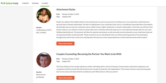 BetterHelp’s Classes aren’t something I’ve personally tried yet, but my therapist recommended it and told me it’s really helpful for some people. The feature is essentially an online, live seminar you can attend with other folks. Some topics on my dashboard include: Setting Boundaries: The Power of the Door, Narcissistic Personality Disorder: When Self-Love Is Not Love, and Understanding and Living With Depressive Disorders.