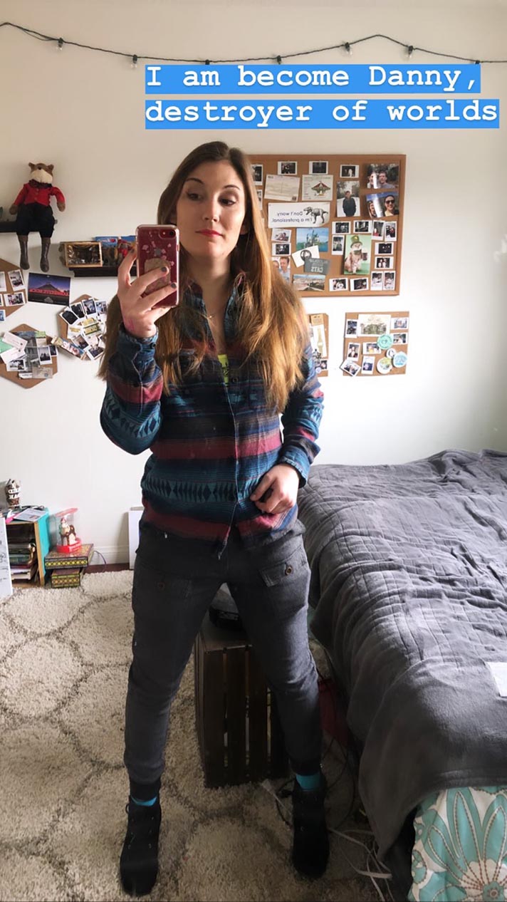 They had experienced this exact phenomenon two Halloweens ago, when Lauren borrowed some of her boyfriend’s clothes to dress up as her coworker Brock. “Those pants were vintage,” he said, like maybe he was still a little nervous about it a year and a half later. Lauren says she avoided borrowing one of Daniel’s oldest shirts for this swap because she didn’t want to be anxious about him being anxious. “The orange one?” Daniel asked, “You should have taken that one, it’s on its last legs anyway, and it’d look cute on you.”