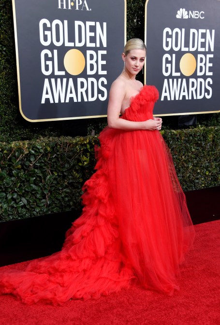 Riverdale star Lili Reinhart tends to fly under the radar as far as red carpet style goes. Unlike stars who’ve made a career breaking the fashion mold at any and every event they attend (ahem, Lady Gaga), Reinhart has traditionally opted for simpler, more understated ensembles—until tonight. Reinhart made her Golden Globes debut at this year’s ceremony, wearing a look as dramatic as the CW show she stars in. Reinhart’s 2019 Golden Globes look consisted of a massive, red ball gown and—wait for it—matching eyeshadow.