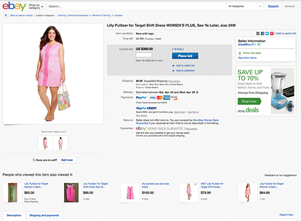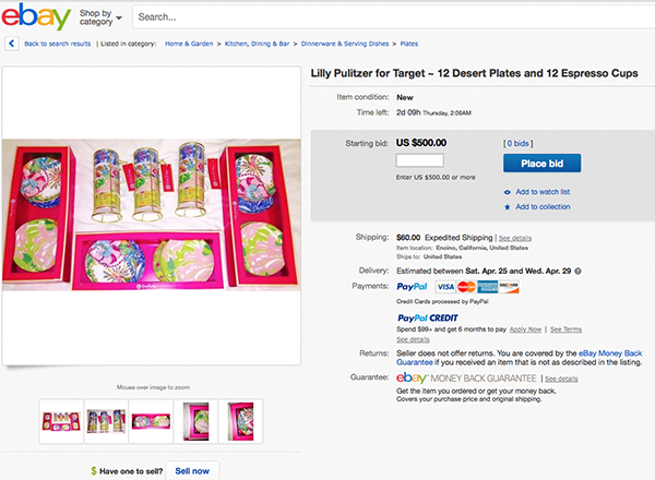 Those left disappointed by the fact that Target’s Lilly Pulitzer collaboration crashed Target’s website when it launched on Sunday, then sold out fully online by noon that same day (which was quickly branded “preppy black friday”) likely turned to the next best option to get a piece of the action—eBay. But the frantic demand for the collection has spurred an absolutely insane markup for many of the collection’s most popular pieces on the auction site—which already lists thousands of items for sale.