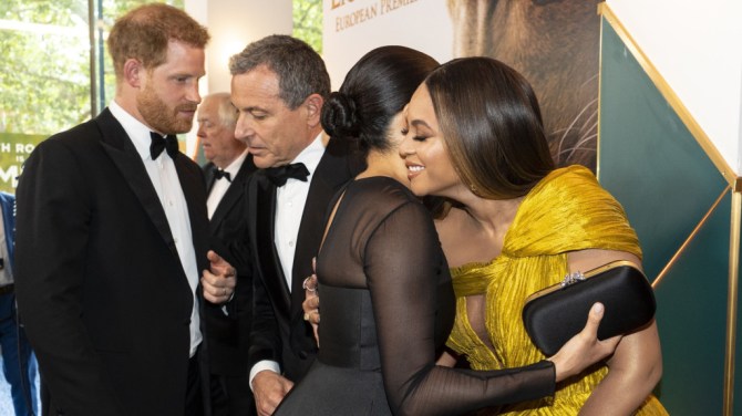 The power couples seemed to get on well, chatting happily and even hugging before the screening. Perhaps Meghan and Harry congratulated Beyonce on her lead role as Nala in the Disney live-action remake. Or maybe they thanked Bey and Jay for the shout-out — during their 2019 Brit Awards acceptance speech, they gave a nod to Meghan by standing in front of a portrait of her decked out in jewels and wearing a crown.
